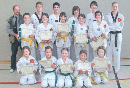 Leveste (mh). Für 13 Tae-Kwon-Do-Kämpfer des TV Jahn Leveste standen am Donnerstagabend Gürtelprüfungen auf dem Programm. Unter der Leitung des Trainer-Duos Stefanie Kusche (3. Dan) und André Jordan (2. Dan) sowie unter den kritischen Blicken des NTU-Prüfers und erfolgreichsten Vereinsmitglieds Carsten Runge (5. Dan) bewarben sich die Kämpfer um die nächsthöhere Gürtelfarbe. Sechs Anfänger, die zum ersten oder zweiten Mal geprüft wurden, fünf Sportler, die sich um den gelb/grünen oder grünen Gürtel bewarben sowie zwei Prüflinge, die den braunen Gürtel anvisierten, mussten die verschiedensten Tritt-, Schlag- und Abwehrtechniken vorführen. Die Fortgeschrittenen hatten diese gesprungen oder mit Drehsprung auszuführen. Neben der Darstellung der Kunstformen (Poomse) und Selbstverteidigungstechniken verschiedener Schwierigkeitsgrade, legte der Prüfer viel wert auf den Vollkontaktkampf, der mit voller Schutzausrüstung durchgeführt wurde. Zudem wurde theoretisches Wissen abgefragt. Hier erklärten die Prüflinge die koreanischen Bezeichnungen der einzelnen Techniken oder erläuterten verschiedene Wettkampfregeln. Höhepunkt der Prüfung war der „Bruchtest“ für die beiden Blaugurte, die ein zwei Zentimeter dickes Holzbrett mit einer freien Tritttechnik durchschlagen mussten. Die Tae-Kwon-Do-Sparte des TV Jahn Leveste freut sich jederzeit über Nachwuchs. Anfänger und Kinder können dienstags und donnerstags (18.15 bis 19.15 Uhr), Jugendliche und Fortgeschrittene an den selben Tagen (18.15 bis 20 Uhr) in das Training hineinschnuppern (Quelle: Deister-Leine-Zeitung).