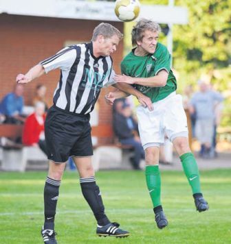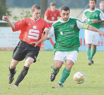 Das Duell der Kapitäne: Levestes Nabil Habibi (rechts) setzt sich gegen den Niedernwöhrener Marcel Kasseck durch. Foto: Deppe (Calenberger Zeitung)