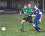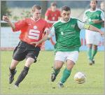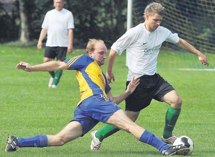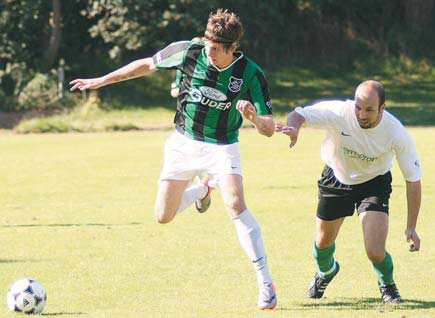 Zu spät: Der Levester Robert Aue (links) ist gegen Marco Heetel von der SpVgg. Bad Pyrmont einen Schritt zu langsam und muss seinen Gegenspieler ziehen lassen. Foto: Deppe (Calenberger Zeitung)
