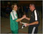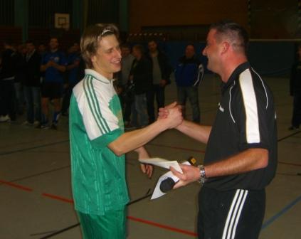 Siegerehrung - Levestes Kapitän Dennis Lublow nimmt die Glückwünsche von Hallensprecher Oliver Pinkert entgegen