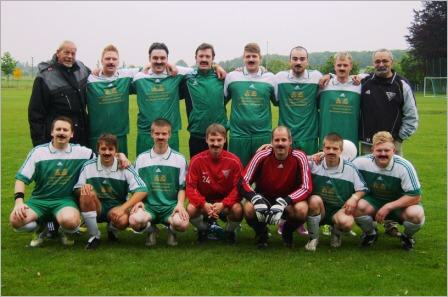 Alle mit Bart - Zum letzten Spiel ihres Trainers Uwe Plath (hintere Reihe rechts) lief die Jahn-Mannschaft in Weetzen mit angeklebten Bärten auf.