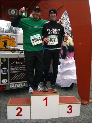 Hannover (He). Pascal Mateyka und Christian Helmstedt von der II. Herren des TV Jahn Leveste hatten sich auch zum Jahresabschluss 2011 wieder viel vorgenommen: Auch ohne ihren verhinderten Handballkumpanen Endric Müller (TSV Barsinghausen) wollten die beiden Fußballer beim traditionellen HDI-Silvesterlauf um den hannoverschen Maschsee ihrem Motto treu bleiben und den Vorjahressiegern Philip Champignon und Florian Reichert sowie auch Favorit Dirk Schwarzbach vom TSV Kirchdorf möglichst lange Paroli bieten. Ein mitlaufendes Krokodilpärchen, die altbekannten Blues Brothers, zwei rosa Monster und ein Mann in Frauenkleidern stellten die Kicker aus der 2. Kreisklasse auf der 5,8 Kilometer langen Strecke vor keine allzu großen Probleme. Allerdings hatten Verteidiger Mateyka und Torwart Helmstedt nicht mit John Mooney gerechnet: Der Senkrechtstarter vom PTSV Rosenheim siegte mit neuem Streckenrekord (17:41 Minuten) und verwies sogar das Kirchdorfer Trio auf die weiteren Plätze. „Wir hatten uns eigentlich auf die TSV-Läufer eingestellt. Auf den Bayrischen Meisterrenner waren wir nicht vorbereitet. Dennoch ein klasse Leistung sowohl vom Sieger, als auch von den Kirchdorfer Athleten. Herzlichen Glückwunsch dazu“, erwiesen sich die beiden Jahn-Kicker zum wiederholten Male als faire Verlierer. Pascal Mateyka erzielte mit 26:07 Minuten und dem 281. Platz dennoch ein beachtliches Resultat. Christian Helmstedt schaffte es in 36:44 Minuten immerhin noch auf Rang 1021. Nach der Siegerehrung und einem Heißgetränk erneuerten die Ballsportler wie immer augenzwinkernd die Kampfansage für das kommende Event: „Nächstes Jahr müssen sich John Mooney und die Kirchdorfer Läufer warm anziehen. Wir geben nicht auf!“ |