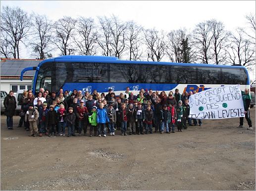 (Von Uwe van der Felde) Mit 28 Spielern der G- und F-Jugend hat der TV Jahn Leveste am 03.03.2012 das Bundesliga-Heimspiel von Hannover 96 gegen den FC Augsburg besucht. Auf die F-Jugendlichen wartete dabei eine ganz besondere Aufgabe. Sie durften beim Einlaufen der Mannschaften auf dem Rasen der AWD-Arena Spalier stehen für die Spieler von Hannover 96. So konnten sie ihre Stars einmal ganz aus der Nähe betrachten. Ein aufregendes Erlebnis für die Nachwuchskicker des TV Jahn, da sie auch die 96-Spaliertrikots als Souvenir behalten durften. Zuvor bekamen Spieler, Geschwister und Eltern im Vereinsheim Leveste von Wirtin Ines Dismer ein gemeinsames Mittagessen serviert. Dann ging es für die 80 Personen mit einem Reisebus und 3 Kleinbussen Richtung Hannover. Schon während der Fahrt wurde mehrfach die 96-Hymne „96 – Alte Liebe“ angestimmt. Während des Spiels wurden kräftig die Daumen gedrückt und 96 lautstark angefeuert. Sogar ein großes Transparent wurde von den Schwestern eines Spielers gebastelt. Trotz des späten Augsburger Ausgleichs ging es nach dem Spiel mit guter Stimmung im Bus zurück nach Leveste. Dort wurde der gemeinsame Ausflug gut gelaunt beendet. Organisator Marc Böttcher und Trainer Uwe van der Velde freuen sich über den reibungslosen Ablauf des Tages und die vielen strahlenden Gesichter der kleinen Kicker, denen dieser Tag noch lang in Erinnerung bleiben wird. Für die bevorstehenden Rückrunden dürfte der Ausflug einen mächtigen Motivationsschub gebracht haben. Der tolle Zusammenhalt der beiden Mannschaften, die auch schon im Sommer und zu Weihnachten gemeinsam gefeiert haben, wird durch dieses Erlebnis noch weiter gestärkt. |