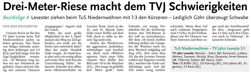 (Von Jens Niggemeyer, Calenberger Zeitung) So etwas nennt man wohl eine Packung: Beim Aufsteiger SG 74 Hameln ist Bezirksligist TV Jahn Leveste gestern mit 1:7 mächtig unter die Räder gekommen. Als Ursachen für das Auftaktdebakel machte Coach Holger Schwabe „mangelnde Laufbereitschaft“ und schwaches Zweikampfverhalten aus. „Wir haben in keiner Phase richtig dagegengehalten“, monierte er. Dazu sei die spielerische Klasse der Platzherren gekommen. „Die haben schon massiv Qualität in der Offensive“, erkannte Schwabe neidlos das Potenzial der SG an. „Das sah manchmal schon nach spanischem Fußball aus“, spielte der Levester Chef auf das sehenswerte Kombinations- und Kurzpassspiel der Gastgeber an. Die neuformierte Viererkette hatte reichlich zu tun und erwies sich, auch weil es an der nötigen Unterstützung vonseiten des Mittelfelds fehlte, in vielen Phasen als überfordert. „Da muss ich mir in der Woche Gedanken machen.“ Weil die Hamelner allerdings in der Defensive durchaus Schwächen zeigten, kamen auch die Gäste zu Möglichkeiten: Eine davon nutzte José Ferrer Romera zum 1:0 (13.). Aber auch Mario Rose (18., 77.) und Hendrik Göhr (38., 58., 69., 88.) boten sich gute Chancen. „Das zeigt, dass die Hamelner anfällig sind.“ Die Levester waren es an diesem Tag jedoch noch um ein Vielfaches mehr. „Wenn Benni Büchter nicht so einen guten Tag gehabt hätte, wäre es noch übler ausgegangen“, lobte Schwabe seinen Keeper, der bei sechs Großchancen überragend parierte. Bei den Gegentreffern war er jedoch machtlos. „Wir standen herum wie Fahnenstangen“, meinte Schwabe, der jetzt als Psychologe gefragt ist. TV Jahn Leveste: Büchter – Parwanta, Benne, Koziak, Fätckenheuer (58. Altinova), Ferrer Romara, Nicolai, Rose, Yildirim (27. Kessar), Tuereyen (72. Soltani), Göhr Tore: 0:1 Ferrer Romera (13.), 1:1 Balk (24.), 2:1 Deck (27.), 3:1 Wyrwoll (30., Elfmeter), 4:1 Hilker (46.), 5:1 Parwanta (55., Eigentor), 6:1 Schumachers (71.), 7:1 Wyrwoll (89.) |