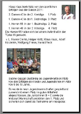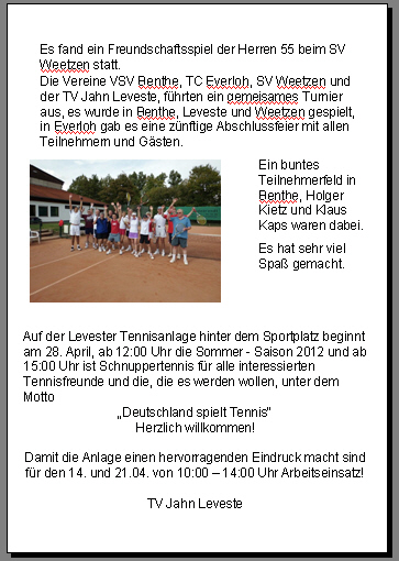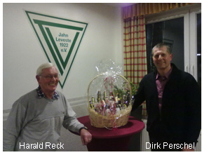 Generationswechsel am 14.03.: In der Tennissparte des TV Jahn Leveste wurde in der Jahreshauptversammlung Dirk Perschel von allen Tennisfreunden als neuer Spartenleiter gewählt, nur er hatte sich mit seiner Stimme enthalten. Harald Reck, der über Jahre in verschiedenen Bereichen der Tennissparte zuletzt als Spartenleiter viele Aufgaben übernommen hatte, wurde vom Sportwart K. Kaps mit einem Präsentkorb und besten Wünschen in den Nicht-Ruhestand entlassen.Gleichzeitig wurde Annette Hettich einstimmig wieder gewählt. |