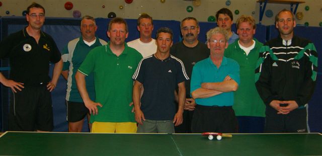 (He) Uwe Plath war auch 2007 nicht zu stoppen: Nach 2005 und 2006 sicherte sich der Routinier der I. Herrenmannschaft bereits zum 3. mal in Folge den Einzeltitel des Tischtennisvereinsmeisters des TV Jahn Leveste. Im Doppel triumphierte das Duo Stefan Otto/Christian Helmstedt. In zwei Gruppen schnippelten und schmetterten insgesamt zehn Jahn-Mitglieder um den diesjährigen Einzel- und Doppeltitel. In der Einzelkonkurrenz blieb Titelverteidiger Uwe Plath in seinen drei Vorrundenpartien und zwei Endrundenpartien ungeschlagen. Einzig im Auftaktmatch gegen den späteren Vizemeister Christian Helmstedt musste beim knappen 3-2-Erfolg der fünfte Satz entscheiden. Auf den Plätzen zwei und drei folgen mit Christian Helmstedt und Stefan Kahlert zwei Spieler aus der 2. Herren. In der Doppelkonkurrenz bleib das Pärchen Stefan Otto/Christian Helmstedt ungeschlagen und gewann seine vier Partien jeweils mit 3-1 Sätzen. Zweiter wurde das Duo Uwe Plath/Hartmut Becker-Fechner vor Lars Langer/Bernhard Altrock. |
