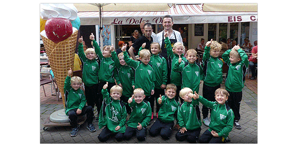 Unsere Altsenioren haben mit einem 9:1-Heimerfolg gegen die SG Bantorf/Hohenbostel die Spielzeit auf dem 3. Tabellenplatz beendet. "Ich kann mich nicht erinnern, dass wir in den letzten Jahren besser abgeschlossen haben. Sportlich war das eine gute Saison von uns", lobte Spielertrainer Lutz Wilhelm die tolle Platzierung. Gute Nachrichten gab es auch nach der finalen Partie. Lutz Wilhelm wird auch weiterhin die Mannschaft betreuen. Achim Hachmeister bedankte sich im Namen der Mannschaft und des Vorstandes beim Jahn-Coach für den vorbildlichen Einsatz rund um das Team. Beim gemeinsamen Abschlussgrillen auf der Sportanlage wurde bis spät in die Nacht gut gelaunt der Saisonausklang gefeiert. "Es war ein schöner Abend", freute sich der alte und neue Trainer Lutz Wilhelm. ![]() Gehrden / Leveste (HE) Der Ladentisch des Eis-Cafés La Dolce Vita in der Gehrdener Fußgängerzone war fest in Grün-Weißer Hand. 15 Kickerinnen und Kicker der G-Junioren des TV Jahn Leveste standen in schicken neuen Trainingsanzügen und mit großen Augen vor der verlockenden Eisauslage und bestellten bei Eisverkäufer Hariz Othman fleißig ihre Lieblingsorten.