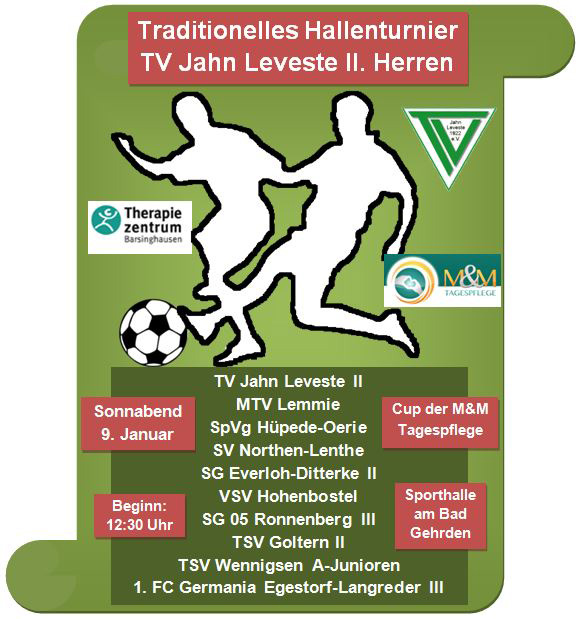Leveste/Gehrden (He) Zum traditionellen Hallenturnier lädt am kommenden Sonnabend (9. Januar) die II. Herren des TV Jahn Leveste ein. Ab 12:30 Uhr rollt der Ball in der Sporthalle am Hallenbad in Gehrden (Lange Feldstraße 12). 10 Mannschaften in zwei Gruppen spielen dann um den Cup der "M&M Tagespflege", den Mathias Petters und Mario Elsner spendieren. Neben dem Gastgeberteam sind mit Vorjahressieger MTV Lemmie, dem SV Northen-Lenthe, der SpVg Hüpede-Oerie, dem 1. FC Germania Egestorf-Langreder III sowie dem TSV Goltern II insgesamt sechs Teams aus der 2. Kreisklasse vertreten. Der VSV Hohenbostel, die SG Everloh-Ditterke II und die SG 05 Ronnenberg III sind allesamt in der 3. Kreisklasse am Ball. Die A-Junioren des TSV Wennigsen, im Vorjahr erst im Halbfinale gestoppt, komplettieren das Teilnehmerfeld. Das Auftaktmatch bestreiten Hohenbostel und Wennigsen. Das erste Halbfinale ist für 17:22 Uhr angesetzt, das Endspiel soll um 18:04 Uhr angepfiffen werden. Für das leibliche Wohl der Zuschauer und Aktiven sorgt die Mannschaft des Veranstalters.