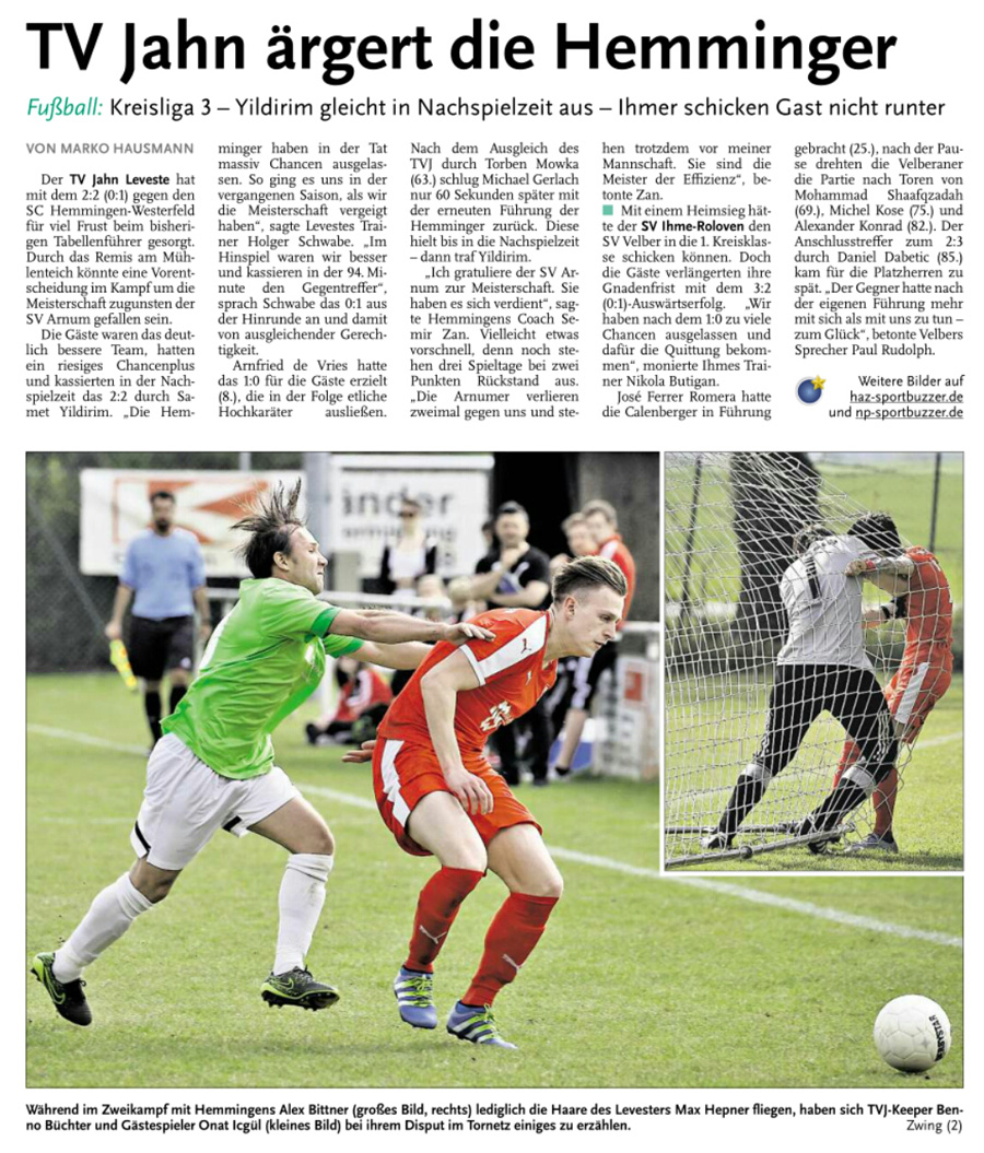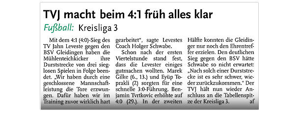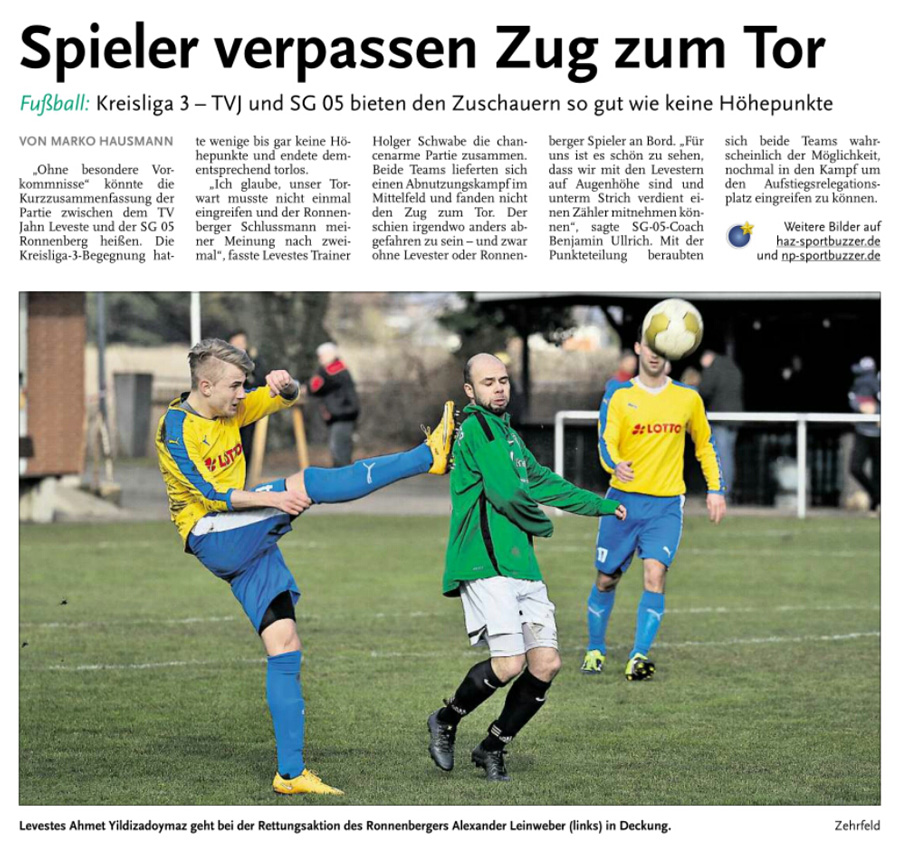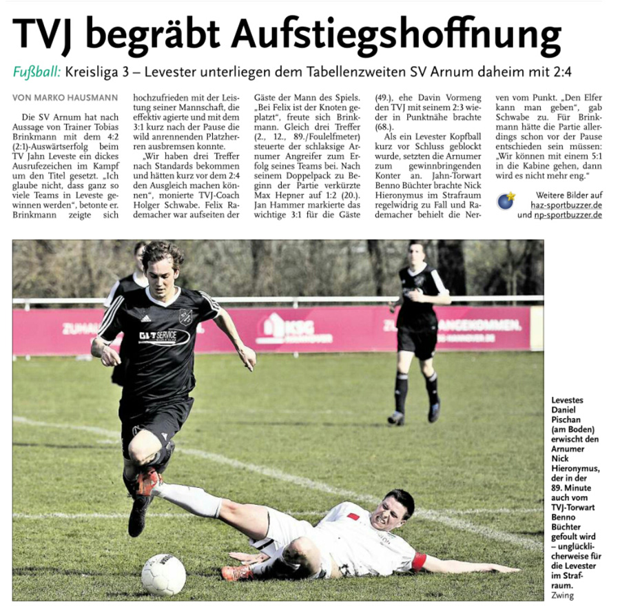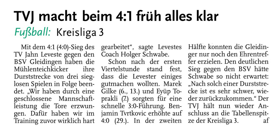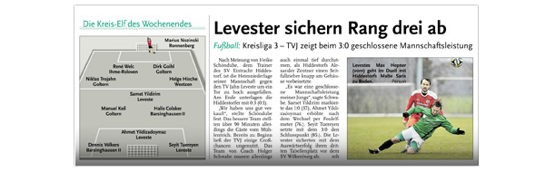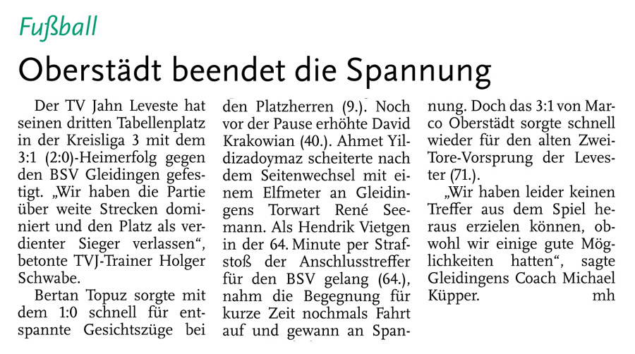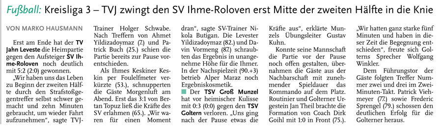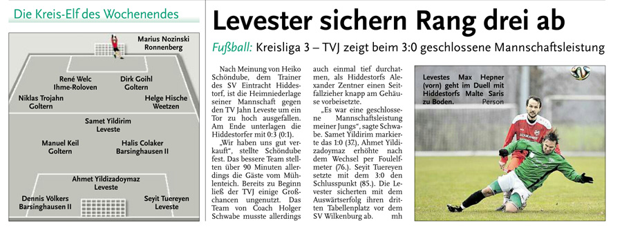 Die diesjährige Abteilungsversammlung findet am 30.03.2016 um 20:15 Uhr im Sportheim des TV Jahn Leveste statt. Wir freuen uns über zahlreiches Erscheinen. ![]() CZ (Marco Hausmann) Der TV Jahn Leveste hat sein Nachholspiel in der Kreisliga 3 beim TSV Goltern mit 1:0 (0:0) gewonnen. „Es war auf dem Ascheplatz ein intensives Spiel, das wir am Ende verdient gewonnen haben“, sagte TVJ-Trainer Holger Schwabe. Für das Tor des Tages sorgte Ersin Tobrakli, der einen Freistoß in der 64. Minute sehenswert direkt verwandelte. Die Levester hätten allerdings schon zuvor in Führung gehen können, doch Torben Mowka scheiterte an der Latte (4.) und nur zwei Minuten später am Golterner Torwart. „Wir haben uns gut verkauft und leider durch einen sehr starken Standard verloren“, betonte TSV-Sprecher Wolfgang Winkler, der seiner Mannschaft einen Punkt gegönnt hätte. „Es war meiner Meinung nach ein ausgeglichenes Spiel mit leichten Vorteilen für die Levester nach der Pause“, resümierte Winkler. ![]()