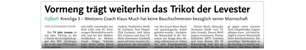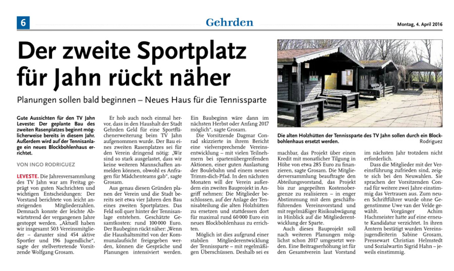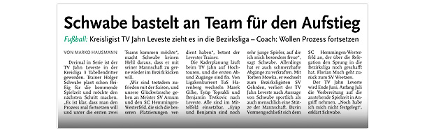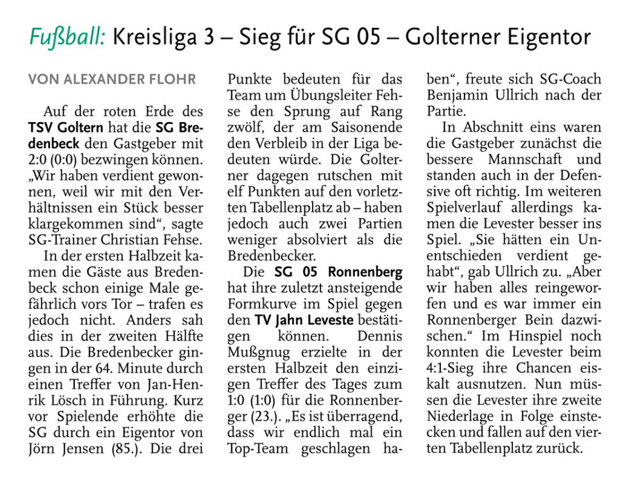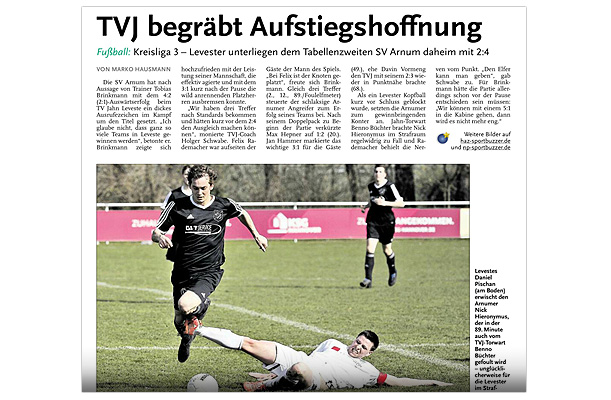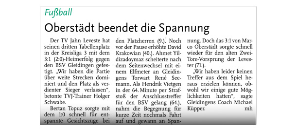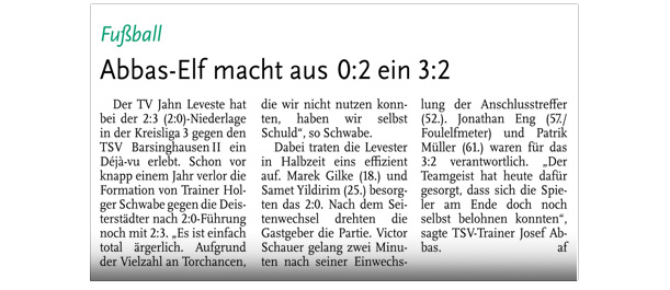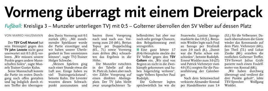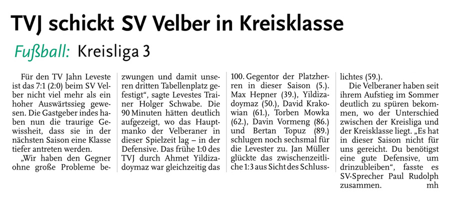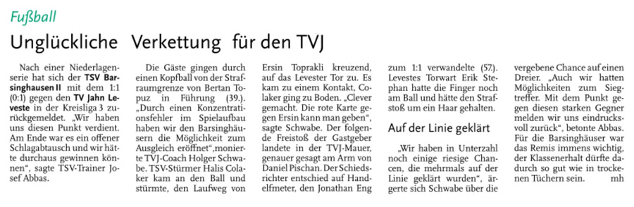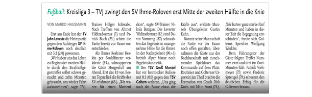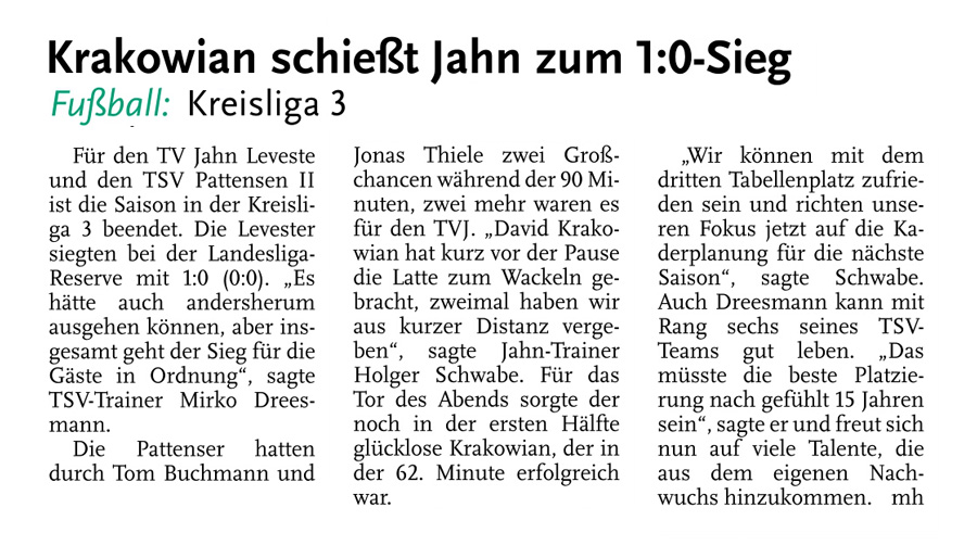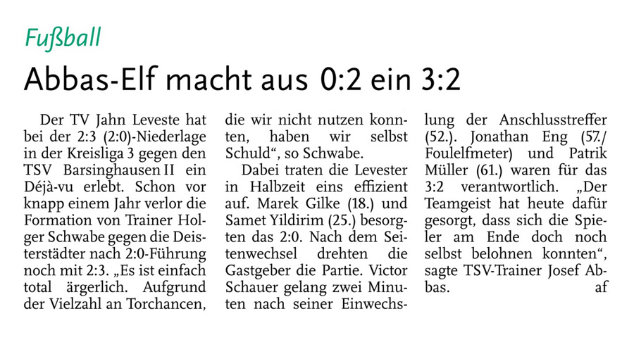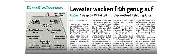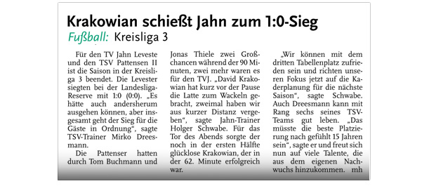 Die diesjährige Abteilungsversammlung findet am 30.03.2016 um 20:15 Uhr im Sportheim des TV Jahn Leveste statt. Wir freuen uns über zahlreiches Erscheinen. ![]() CZ (Marco Hausmann) Der TV Jahn Leveste hat sein Nachholspiel in der Kreisliga 3 beim TSV Goltern mit 1:0 (0:0) gewonnen. „Es war auf dem Ascheplatz ein intensives Spiel, das wir am Ende verdient gewonnen haben“, sagte TVJ-Trainer Holger Schwabe. Für das Tor des Tages sorgte Ersin Tobrakli, der einen Freistoß in der 64. Minute sehenswert direkt verwandelte. Die Levester hätten allerdings schon zuvor in Führung gehen können, doch Torben Mowka scheiterte an der Latte (4.) und nur zwei Minuten später am Golterner Torwart. „Wir haben uns gut verkauft und leider durch einen sehr starken Standard verloren“, betonte TSV-Sprecher Wolfgang Winkler, der seiner Mannschaft einen Punkt gegönnt hätte. „Es war meiner Meinung nach ein ausgeglichenes Spiel mit leichten Vorteilen für die Levester nach der Pause“, resümierte Winkler. ![]()