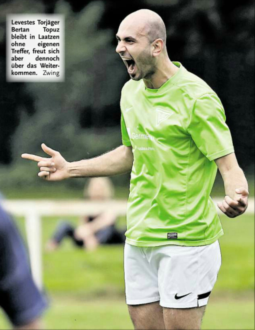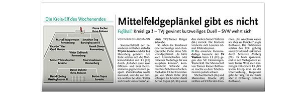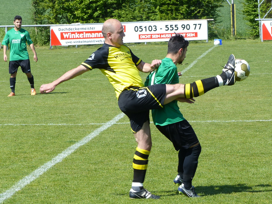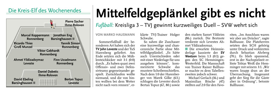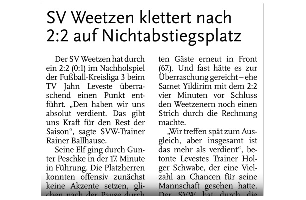 Eine Serie von 18 Pflichtspielen ohne Niederlage seit Anfang April ging für den TV Jahn Leveste im Pokal zu Ende. Mit 3:4 nach Elfmeterschießen musste sich das Team von Holger Schwabe, zu dem mit Hendrik Großmann ein Kicker der Reservemannschaft gehörte, bei SuS Sehnde geschlagen geben. „Ich bin trotzdem super zufrieden mit der Leistung“, sagte der Jahn-Coach. „Wir hatten genau elf Spieler dabei. Aber ich würde sagen, wir hatten etwas mehr vom Spiel.“ Die 90 Minuten einer gutklassigen Begegnung blieben indes torlos, was nicht zuletzt an Steven Foss gelegen hat: Der Sehnder Torhüter wehrte in der 44. Minute einen Handelfmeter von Eyüp Toprakli ab. Einen letzten Endes verdienten, wenn auch erst spät herausgeschossenen 3:0 (0:0)-Erfolg feierte der TV Jahn Leveste beim SV Weetzen. Paul Hepner (60.) sowie zweimal Marek Gilke (68., 74.) waren in der finalen halben Stunde des Spiels für die Gäste erfolgreich. „Am Ende haben wir den Gegner müde gespielt“, sagte Levestes Trainer Holger Schwabe. „Wir hatten vor deren Kontern schon Respekt“, gab er zu. Doch außer einer kleineren Torchance durch Malte Vetter sprang für die Weetzener nicht viel heraus. Eine überzeugende Leistung lieferte Paul Hepners Bruder Max ab, der das 2:0 schön auflegte und selbst zudem noch die Latte traf.