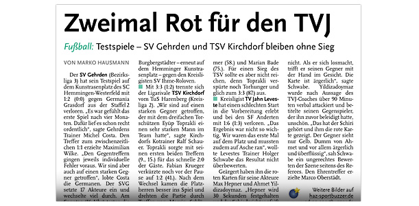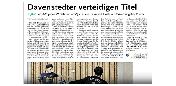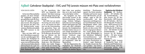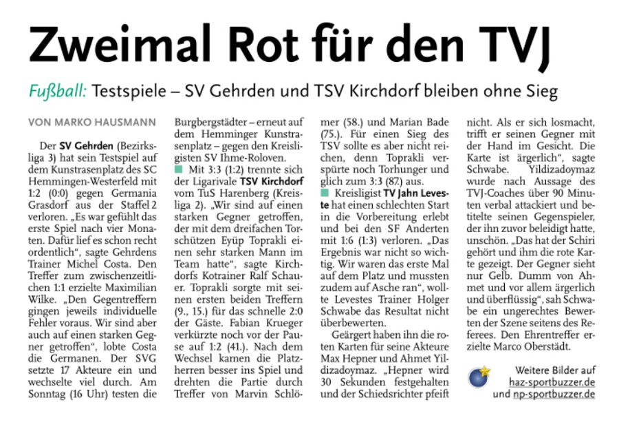Die SpVg Laatzen ist in der 2. Runde des Kreispokals ausgeschieden. Dem klassenhöheren TV Jahn Leveste unterlag sie auf eigenem Platz mit 1:4 (1:3). „In der ersten Halbzeit haben wir uns etwas dumm angestellt. Das war dann schwierig, den Rückstand aufzuholen“, sagte SpVg-Sprecher Nils Noormann. „Aber wir hatten einen starken Gegner und haben uns gut verkauft.“ Nach Treffern von David Krakowian (13.) und Eyüp Toprakli (23.) für die Gäste brachte Mirko Micic (25.) die Laatzener wieder heran. Krakowian (27.) erhöhte schnell wieder, Max Hepner (78.) traf zum Endstand. Nach der Auftaktniederlage gegen den SV Weetzen folgte für den SV Eintracht Hiddestorf gegen den TV Jahn Leveste eine empfindliche 0:8 (0:4)-Heimpleite. Hiddestorfs Trainer Dirk Lautenbacher zeigte sich bedient: „Wir haben den Gästen fünf bis sechs Tore einfach selbst vorgelegt.“ Bereits in der ersten Halbzeit sorgte das Duo Bertan Topuz (12., 17.) und Davin Vormeng (21., 40.) mit der 4:0-Führung für klare Verhältnisse. Nach dem Wechsel erhöhten Eyüp Toprakli (56.), Max Hepner (60.), David Krakowian (71.) und erneut Hepner (90.) auf 8:0.„Das war wirklich deutlich und zeigt, wie gut wir momentan drauf sind“, sagte Jahn-Coach Holger Schwabe. Sein SVE-Pendant Lautenbacher wolle den August indes möglichst schnell herumbekommen, um auf zahlreiche Spieler zurückgreifen zu können, die derzeit noch im Urlaub sind." Leveste (He) Die II. Herren des TV Jahn Leveste sind mit einer 2:5 (1:2)-Niederlage gegen den TSV Kirchdorf II in die Saison der 2. Kreisklasse gestartet. Mann des Tages auf TSV-Seite war Timmy Köppchen, der vier Treffer erzielte. Trotz der Auftaktniederlage war Levestes Trainer Christian Gilica mit dem Auftritt seiner Mannschaft zufrieden. "Wir haben vor allem in der ersten Halbzeit gut mitgespielt und uns einige Möglichkeiten erarbeitet." Weiterlesen »