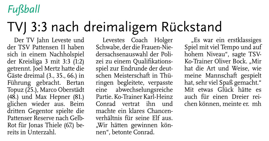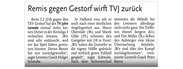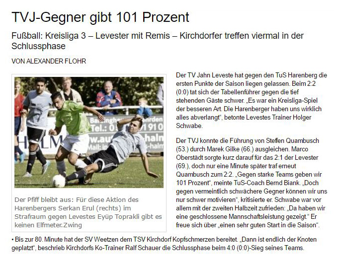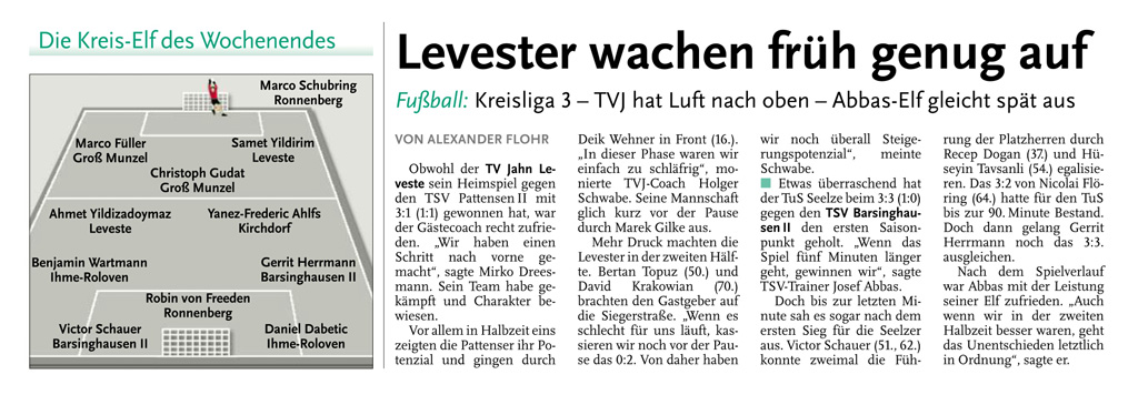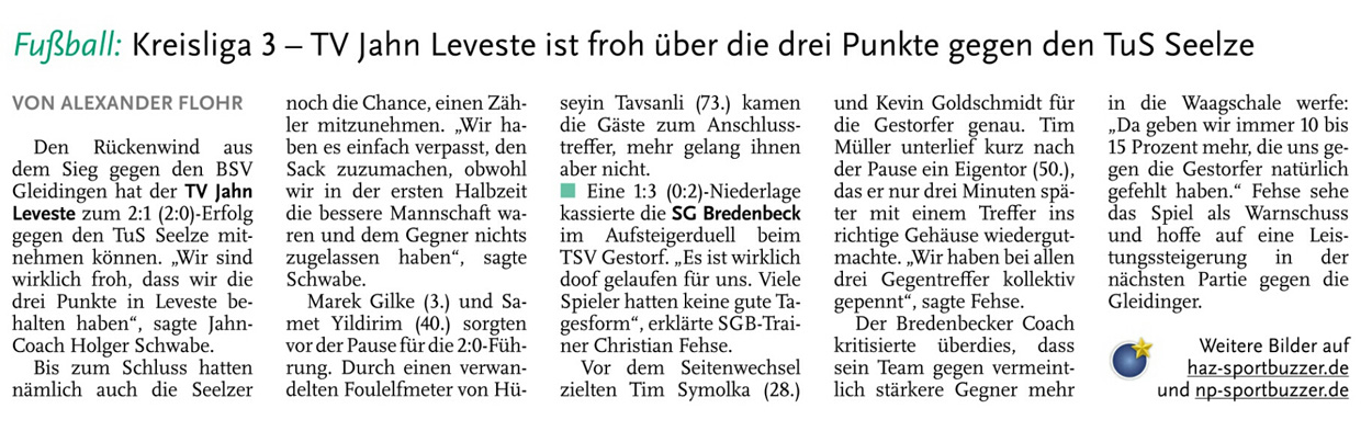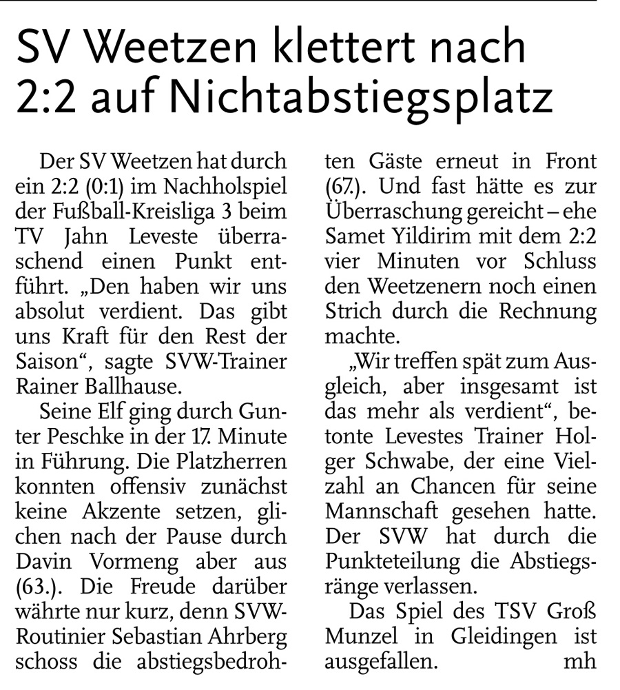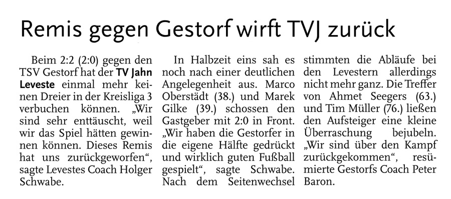 Alexander Flohr Der Primus TV Jahn Leveste kam daheim gegen den SV Wilkenburg nur zu einem 1:1 (1:1). Niklas Römgens brachte die Gäste in Front (34.). Kurz darauf glich der Tabellenführer durch Marek Gilke aus (39.). Trotz mehr Ballbesitzes fand das Team von Holger Schwabe gegen die Mauer-Taktik der Wilkenburger kein Mittel. „Wir haben einfach kein gutes Spiel gezeigt und zwei Punkte liegen gelassen“, ärgerte sich Schwabe. Die strittigste Szene der Partie gab es für ihn in der 69. Minute, als Gilke auf Eyüp Toprakli passte, der die vermeintliche Führung für den Favoriten erzielte. „Völlig fragwürdig, warum der Schiedsrichter auf Abseits entschied. Das Tor war für mich auf keinen Fall diskussionswürdig“, meinte der TVJ-Coach. SVW-Sprecher Martin Volkwein indes freute sich: „Mit ein wenig Glück hätten wir sogar drei Punkte mit nach Hause nehmen können.“