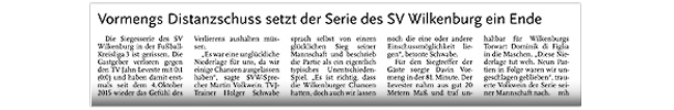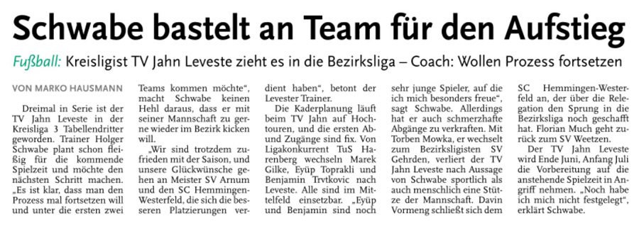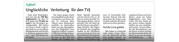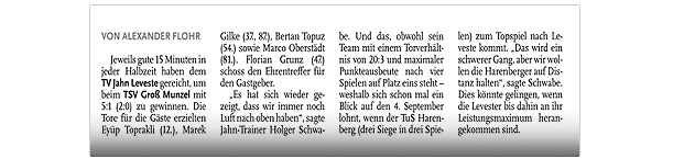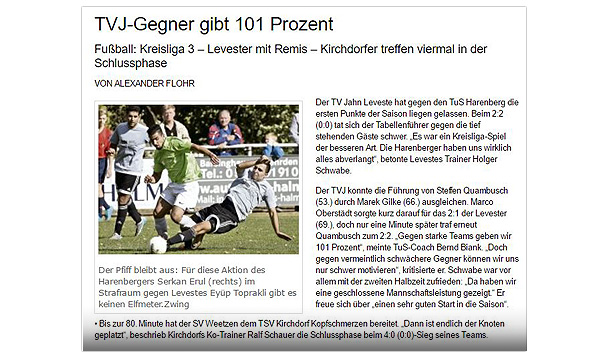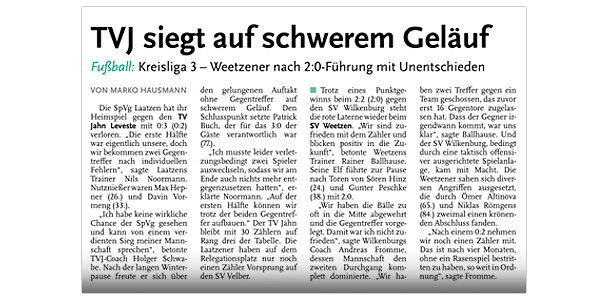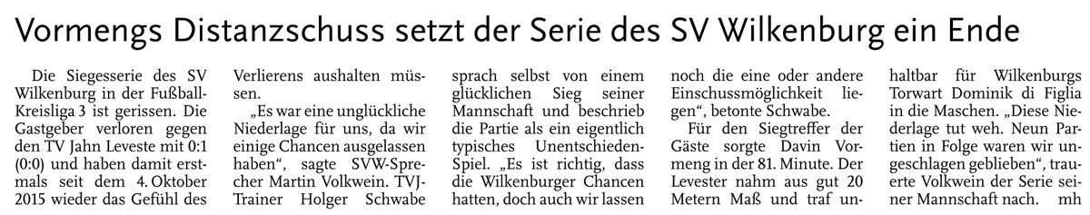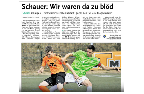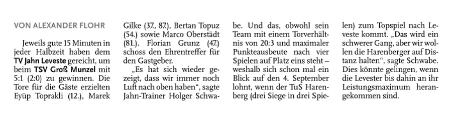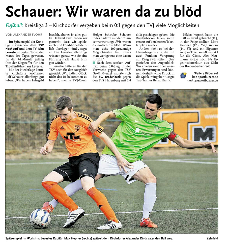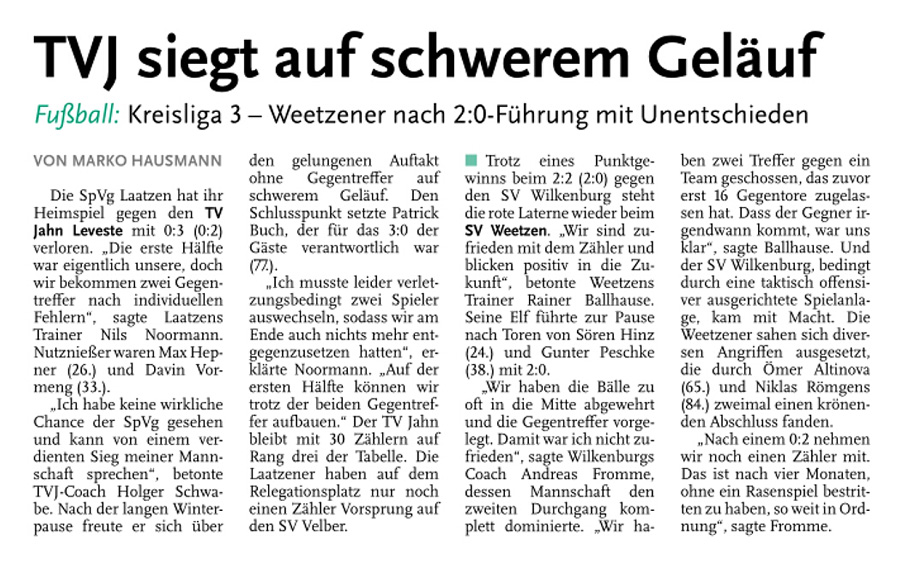 Alexander Flohr Der Primus TV Jahn Leveste kam daheim gegen den SV Wilkenburg nur zu einem 1:1 (1:1). Niklas Römgens brachte die Gäste in Front (34.). Kurz darauf glich der Tabellenführer durch Marek Gilke aus (39.). Trotz mehr Ballbesitzes fand das Team von Holger Schwabe gegen die Mauer-Taktik der Wilkenburger kein Mittel. „Wir haben einfach kein gutes Spiel gezeigt und zwei Punkte liegen gelassen“, ärgerte sich Schwabe. Die strittigste Szene der Partie gab es für ihn in der 69. Minute, als Gilke auf Eyüp Toprakli passte, der die vermeintliche Führung für den Favoriten erzielte. „Völlig fragwürdig, warum der Schiedsrichter auf Abseits entschied. Das Tor war für mich auf keinen Fall diskussionswürdig“, meinte der TVJ-Coach. SVW-Sprecher Martin Volkwein indes freute sich: „Mit ein wenig Glück hätten wir sogar drei Punkte mit nach Hause nehmen können.“
