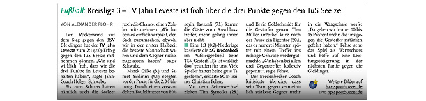 Leveste (He) Trotz der 2:4 (2:2)-Niederlage des TV Jahn Leveste II im Nachholspiel gegen den favorisierten Tabellenzweiten SV Northen-Lenthe gab es im Jahn-Lager lobende Worte: "Wir haben zwar in den jeweiligen Anfangsphasen der Halbzeiten Probleme gehabt, in den anderen Spielphasen aber durchaus mitgehalten und einige Nadelstiche gesetzt. Insgesamt haben wir uns gut verkauft", erklärte Jahn-Torhüter Christian Helmstedt, der aufgrund einer Verletzung weiterhin nur zuschauen konnte. Weiterlesen » ![]()