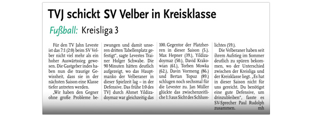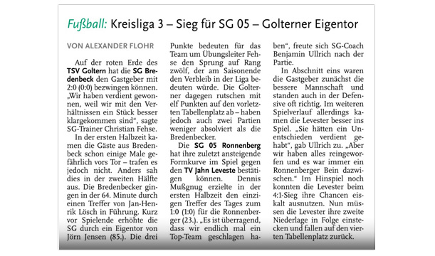 ALEXANDER FLOHR Eine faustdicke Überraschung ist der SG Bredenbeck beim 1:0 (0:0)-Sieg über den TV Jahn Leveste gelungen. Emin Asanoski erzielte das Tor des Tages (54.). „Natürlich sind wir unglaublich froh über den Sieg und die Spieler schicken ohne Ende Nachrichten in der Whats-app-Gruppe herum, aber letztlich war das ein Ausgleich für jene Spiele, die wir zuvor nicht gewinnen konnten“, resümierte SGB-Trainer Christian Fehse. Die Levester konnten sich, anders als zuletzt, nur wenig klare Tormöglichkeiten herausspielen. „Die Jungs sind heute nicht einmal mit dem linken Fuß aufgestanden“, sagte TVJ-Coach Holger Schwabe. Er kritisierte die Laufleistung seines Teams, aber lobte zugleich die gute Leistung der Bredenbecker. Bantorf (HE) Das Spiel zwischen dem TSV Bantorf und dem TV Jahn Leveste II wurde bereits nach 45 Minuten beim Stand von 6:0 für die Hausherren beendet. Die Gäste konnten aufgrund zahlreicher Ausfälle keine spielfähige Mannschaft mehr für die zweite Halbzeit auf das Feld schicken. Weiterlesen »
