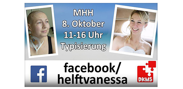 Die Frau eines Spielers unserer 1. Herrenmannschaft braucht Hilfe! Vanessa ist ein Mensch, der immer für andere da ist. Privat und in Ihrem Beruf als Krankenschwester sowieso. Gerade absolvierte sie ihr Medizinstudium, um als Ärztin noch mehr für andere Menschen zu tun. Aber jetzt braucht Vanessa EURE Hilfe. Sie hat Blutkrebs und nur eine Stammzellspende kann ihr Leben retten. Bitte gebt ihr und allen suchenden Patienten weltweit eine Chance auf Leben und lasst euch registrieren. Die Typisierungsaktion für Vanessa findet am 8. Oktober von 11 Uhr bis 16 Uhr in der Medizinischen Hochschule Hannover (Carl-Neuberg-Straße 1) statt. www.dkms.de/de/helft-vanessa-wernigerode www.facebook.com/helftvanessa