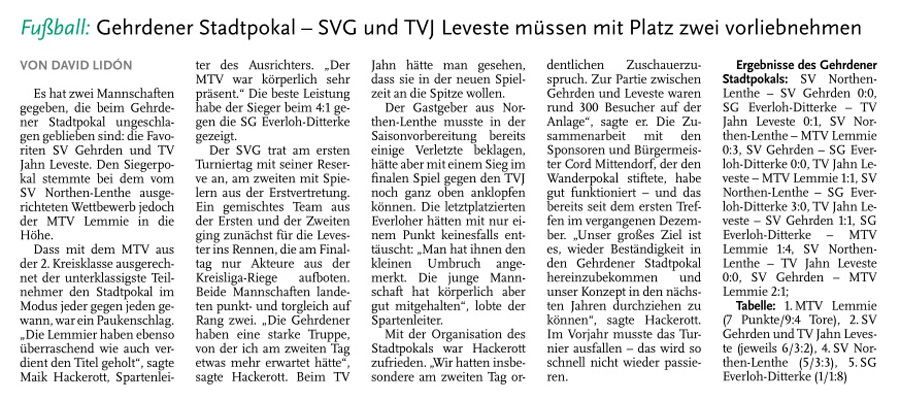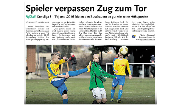 ![]() Leveste (He) "Die II. Herren des TV Jahn Leveste sind beim SV Northen-Lenthe mit 0:5 (0:1) unter die Räder gekommen. "Der Sieg für Northen ist natürlich verdient. Es ist aber auch ein bisschen Schade, denn 70 Minuten haben wir eigentlich ganz gut mitgespielt. Leider haben wir unsere Chancen nicht genutzt", erklärte Levestes Betreuerin Sabine Albert. Weiterlesen » ![]()