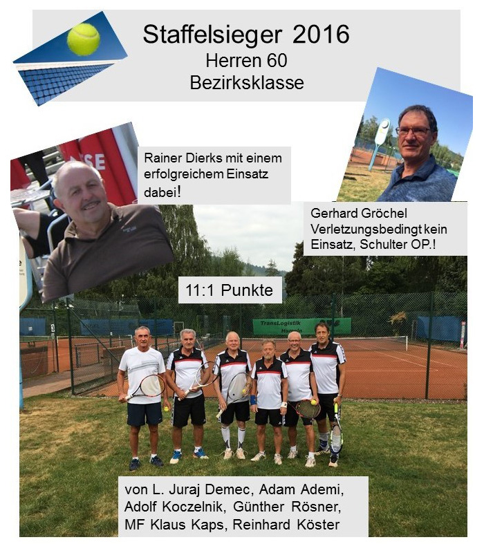 Nach ihrem Abstieg vor zwei Jahren sind unsere Tennisherren 60 in der kommenden Saison wieder in der Bezirksliga am Start. "2015 haben wir die Bezirksklasse auf dem 4. Tabellenplatz abgeschlossen. In diesem Jahr wurden wir Staffelsieger und sind mit 11:1 Punkten aufgestiegen", freut sich Mannschaftskapitän Klaus Kaps. Gegen den TuS Kreuzriehe (5:1), TV Bad Münder (4:2), TK Weser Nienburg (4:2), Landesberger SV (6:0) und Westend Hameln (4:2) verließen die Jahn-Herren den Court jeweils als Sieger. Einzig beim 3:3-Unentschieden gegen den TuS Estorf-Leeseringen gaben die Grün-Weißen einen Punkt ab. Zum Team gehören Reinhard Köster, Günther Rösner, Adam Ademi, Juraj Demec, Adolf Koczelnik, Rainer Dierks, Gerhard Gröchel, Hans-Joachim Stellmacher, Wolfgang Friese, Harald Reck und Klaus Kaps.