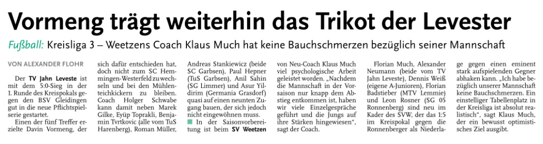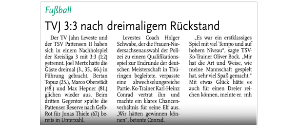 Leveste (He) Jubel am Levester Mühlenteich: Die II. Herren des TV Jahn Leveste hat mit 4:3 (3:3) gegen die SpVg Hüpede-Oerie gewonnen und drei wichtige Punkte im Abstiegskampf verbucht. Den entscheidenden Treffer erzielte der eingewechselte David Meyer in der 75. Spielminute. Weiterlesen » ![]()