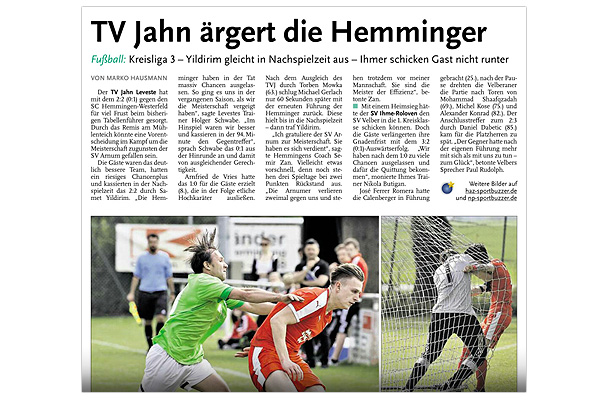 Hemmingen (HE) Auf den ersten Blick scheint die 2:5 (2:3)-Auswärtsniederlage des Tabellenletzten TV Jahn Leveste II bei der Bezirksligareserve des SC Hemmingen-Westerfeld eine klare Angelegenheit zu Gunsten der Gastgeber gewesen zu sein. Jahn-Coach Christian Gilica klärt auf: "Wir haben uns mit unserer Rumpftruppe sehr gut verkauft. Ich bin nicht unzufrieden." Eine zweite Betrachtung unterstreicht die Aussage des Levester Übungsleiters. Nach ordentlicher Anfangsphase hatte der starke Asur-Can Yildirim - eigentlich Torhüter in der Jahn-Erstvertretung - die dicke Chance zur Levester Führung. Der derzeit am Finger verletzte Aushilfsstürmer scheiterte jedoch an SC-Keeper Alexander Thomsen. Weitere Vorstöße der taktisch gut eingestellten Gäste wurden durch Foulspiele gestoppt. Die gelben Karten hatten aus Jahn-Sicht dabei nur statistischen Wert. Innerhalb von fünf Minuten schlugen dann die Gastgeber durch Max Stade (24.), Anthony David Williams (26.) und Bastian Merk (29.) dreimal eiskalt zu. "Wir kassieren unsere Gegentreffer allesamt nach Eckbällen. Da haben wir nicht aufgepasst", haderte Gilica mit seinem Team. Aber die mit drei angeschlagenen Spielern in der Startformation angetretenen Mühlenteichkicker kamen postwendend zurück. Yildirim (40.) und Daniel Ruf (43.) netzten noch vor der Pause zum 2:3-Halbzeitstand ein.