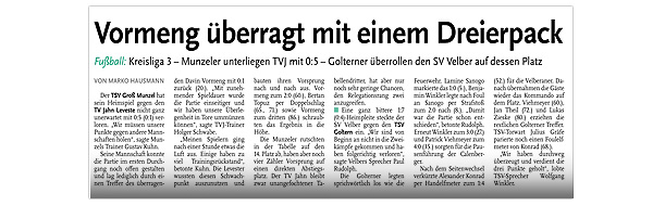 ![]() Leveste (He) Bereits nach 23 Minuten war die Partie zwischen den II. Herren des TV Jahn Leveste und dem TSV Goltern II nahezu entschieden. Die Hausherren lagen gegen den Tabellenletzten zu diesem Zeitpunkt bereits mit 0:5 im Hintertreffen, nach 90 Minuten hieß es 3:6 (1:5) aus Levester Sicht. Weiterlesen » ![]()